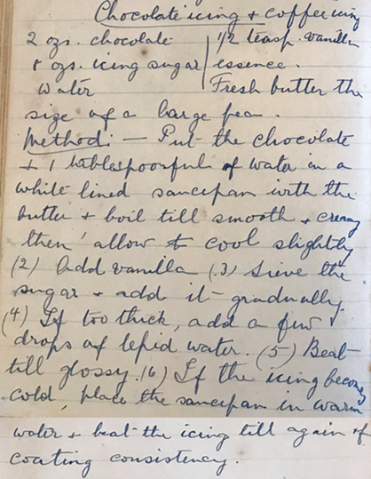2 oz chocolate (or coffee) ½ tsp vanilla essence 8 oz icing sugar Fresh butter the size of a large pea Water | ![]() |