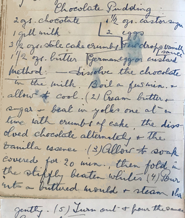 2 oz chocolate 1 ½ oz castor sugar 1 gill milk 2 egg yolks/whites 1 ½ oz butter Few drops vanilla essence 3 ½ oz stale cake crumbs German egg sauce or Custard | ![]() |