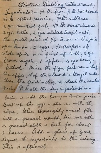| ¼ lb figs ¼ lb stoned raisins 2 oz candied peel 2 oz butter 2 oz shelled Brazil nuts Juice of 1 lemon ½ tsp whole spice Pinch of salt ¼ lb breadcrumbs | ¼ lb sultanas ¼ lb sweet almond 2 eggs Grated rind ½ lemon 1 apple 2 oz brown sugar 2 oz honey | ![]() |