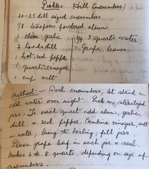 20-25 dill sized cucumbers 1/8 tsp powdered alum 1 clove garlic | 3 qts water 2 heads dill 1 hot red pepper | 1 qt vinegar 1 cup salt Grape leaves | |