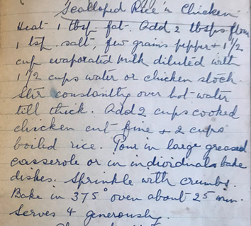 | Heat the fat in a skillet. Add the flour, salt, pepper, evaporated milk diluted with either the water or chicken stock. Stir constantly over hot water until thick. Add the chicken and rice and mix well. Pour into a large, greased casserole or into 4 individual bake dishes. Sprinkle with breadcrumbs. Bake in the oven at 375F for about 25 minutes. | |