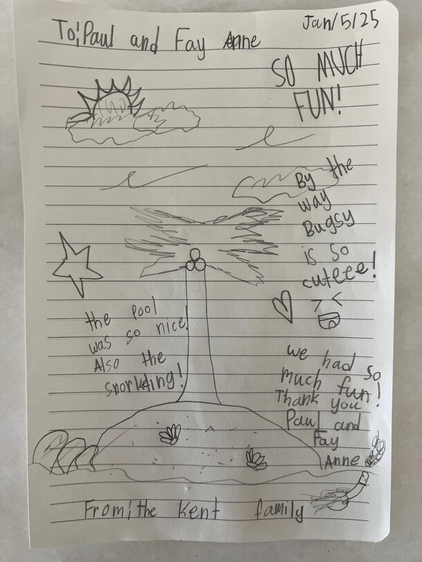 - Guestbook: We loved everything about this place. You can tell Paul and Fay Anne have put so much thought, time and effort into making it perfect. It had everything we could need and more. Our kids loved the movie room and corn hole so much. We did movie night almost nightly. Thank you both so much for sharing your houses with us. We will definitely stay here again should we return to G.C.